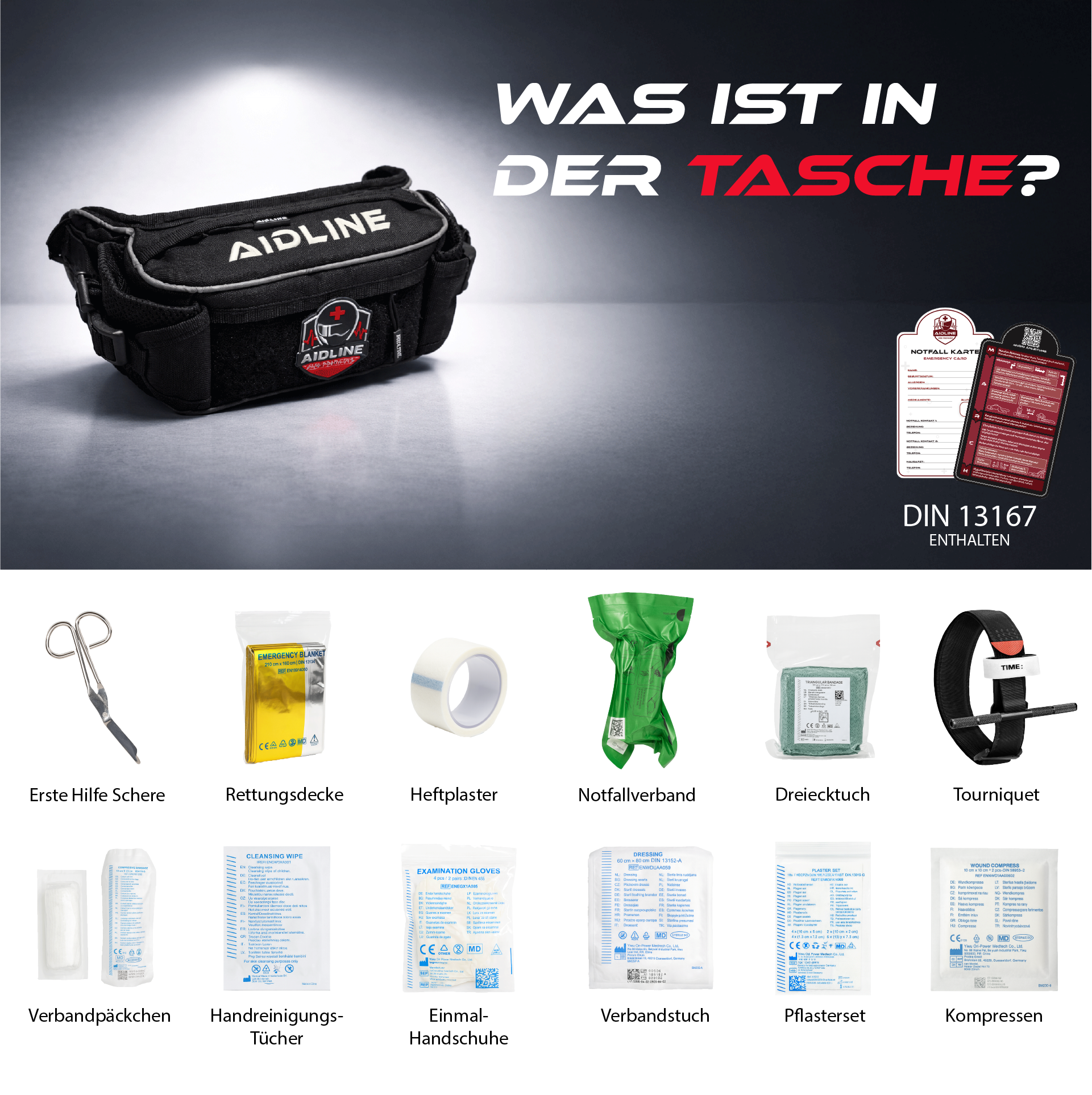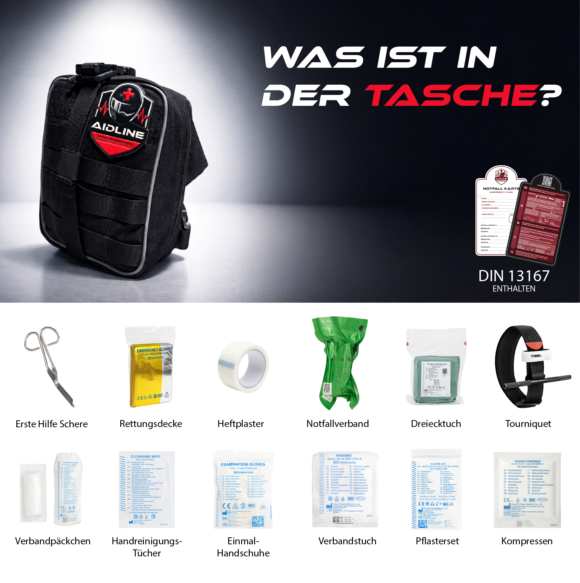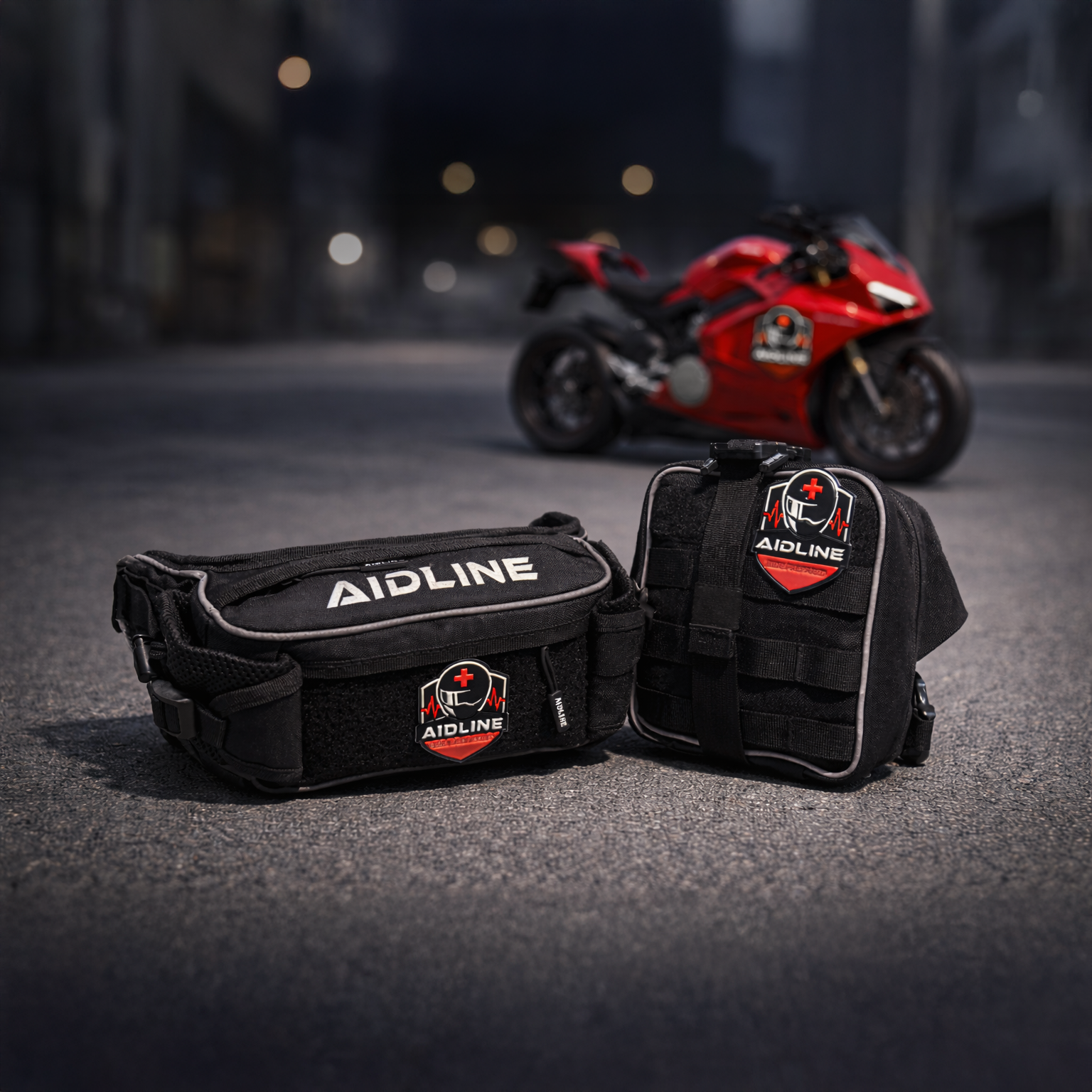 Aidline steht für Erste Hilfe zum Mitnehmen. Unsere Hüfttasche und unsere Beintasche sind kompakt, robust und klar strukturiert. Alles ist so geordnet, dass du im Ernstfall in Sekunden handeln kannst. Ride Prepared.